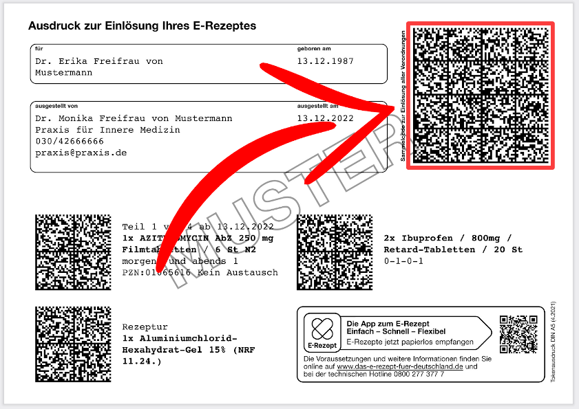 In unserer App (MAG) können Sie über Klick auf die Fläche „Einlösung per eCard-Link“ (direkt unter diesem Hinweis) Ihr Rezept von Ihrer Krankenkassenkarte auslesen und automatisch an uns übermitteln. Alternativ haben Sie die Möglichkeit, Ihr E-Rezept manuell einzuscannen. Bitte scannen Sie dabei ausschließlich den QR-Code oben rechts auf dem Rezept – die weiteren aufgedruckten Codes werden nicht benötigt.