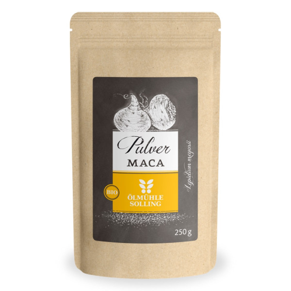Das Maca-Pulver der Ölmühle Solling ist ein Naturprodukt aus kontrolliert biologischem Anbau. Das feine Pulver wird aus der schonend getrockneten Wurzel der Maca-Pflanze ohne Zusätze und in Rohkostqualität hergestellt. Die schonende Trocknung der Wurzel garantiert den Erhalt der wertvollen Aminosäuren, Vitamine und Mineralien, wodurch ein braunbeiges Pulver entsteht. Bio-Maca-Pulver ist vegan, lactose- und glutenfrei.